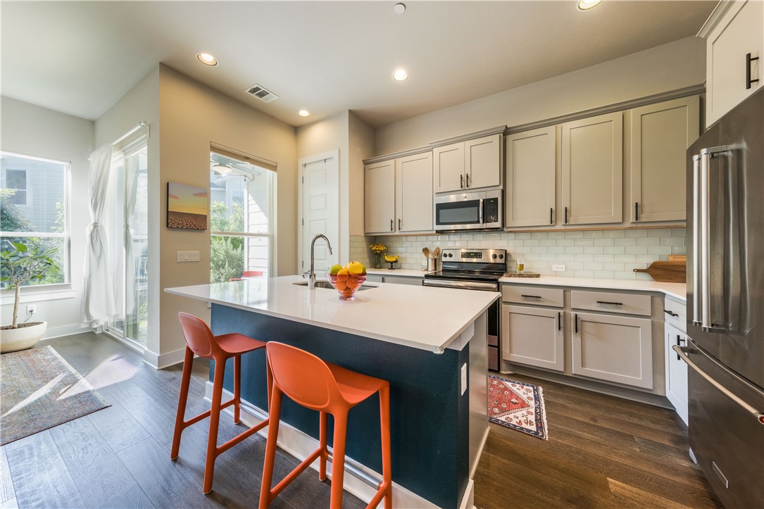 Beautiful Townhome in the Grove Gated Community just minutes from Mueller & Downtown Austin! This 2 bedroom, 2.5 bath condo has a great layout with 10' ceilings, a desirable open living space, a large kitchen island, upgraded cabinets, gorgeous stone counters, stainless appliances, and a covered back patio. The color scheme of this town home is fantastic, and other features include beautiful wood flooring, custom Hunter Douglas window shades, recessed lighting, natural light, beautiful backsplash, built-in shelving, a pantry, one car garage, & lots of storage. Both bedrooms have their very own full bathroom & walk-in closets. The owners suite has a double vanity and walk in shower. Bonus nook at the top of the stairs is perfect for a home office! This home has been well maintained and is move-in ready. The professionally landscaped backyard is fenced in and is a great space for entertaining. This gated community has plenty of guest parking and its very own walking trail! Washer/Dryer will convey, refrigerator is negotiable. With quick access to 51st Street, MLK, and Hwy 183 you’re just minutes from downtown Austin, Mueller, The University of Texas, the Airport, Tesla, Dell Children's Hospital, breweries, amazing Austin eateries, The Thinkery, Mueller Lake Park, & more!!