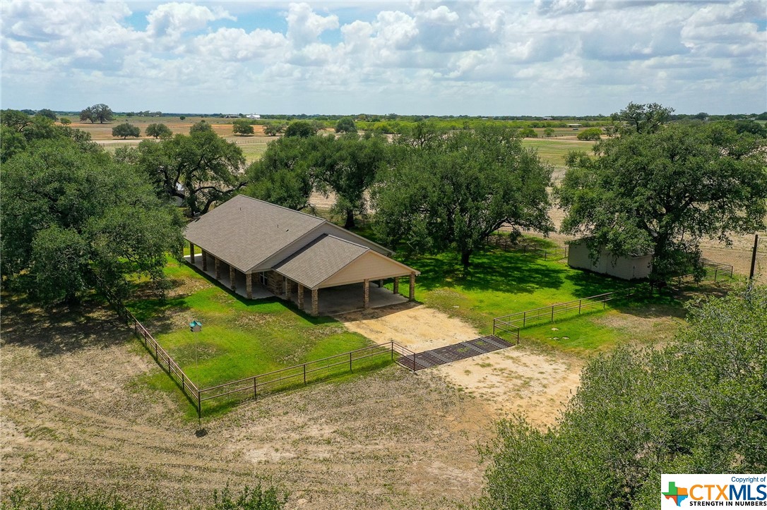 Imagine yourself in this custom crafted home that offers Texas hill country style, unparalleled functionality, and luxurious amenities, all with country surroundings. Nestled within towering mature oaks, this 38+ acre property offers a 3-bedroom, 2 full bath homestead that is tastefully built and surrounded with an outdoor porch area complete with well maintained carpet grass and a pipe fence to keep the cattle out. Custom cabinetry, granite countertops, a gas stove, and walk-in pantry complete the kitchen that opens up into the large living room area. The master suite features a sizable bedroom with a bathroom en suite, equipped with dual sinks, custom cabinetry, and a meticulously-designed walk-in shower and separate jetted tub. Designed for entertainment, the home's open floor plan provides perfect space for friends and family to gather and enjoy each other's company, and if you don't want to be inside, take your party to the outside patio area complete with a country view. The amenities include an outbuilding that can serve as a mancave or other party area, barn, sprinkler system for the yard, cross fencing, pipe cattle pens with a chute, a water well, and a nice pond already stocked with fish. Don't forget to look for the spiral staircase out by one of the trees - could be the beginnings of a nice treehouse.